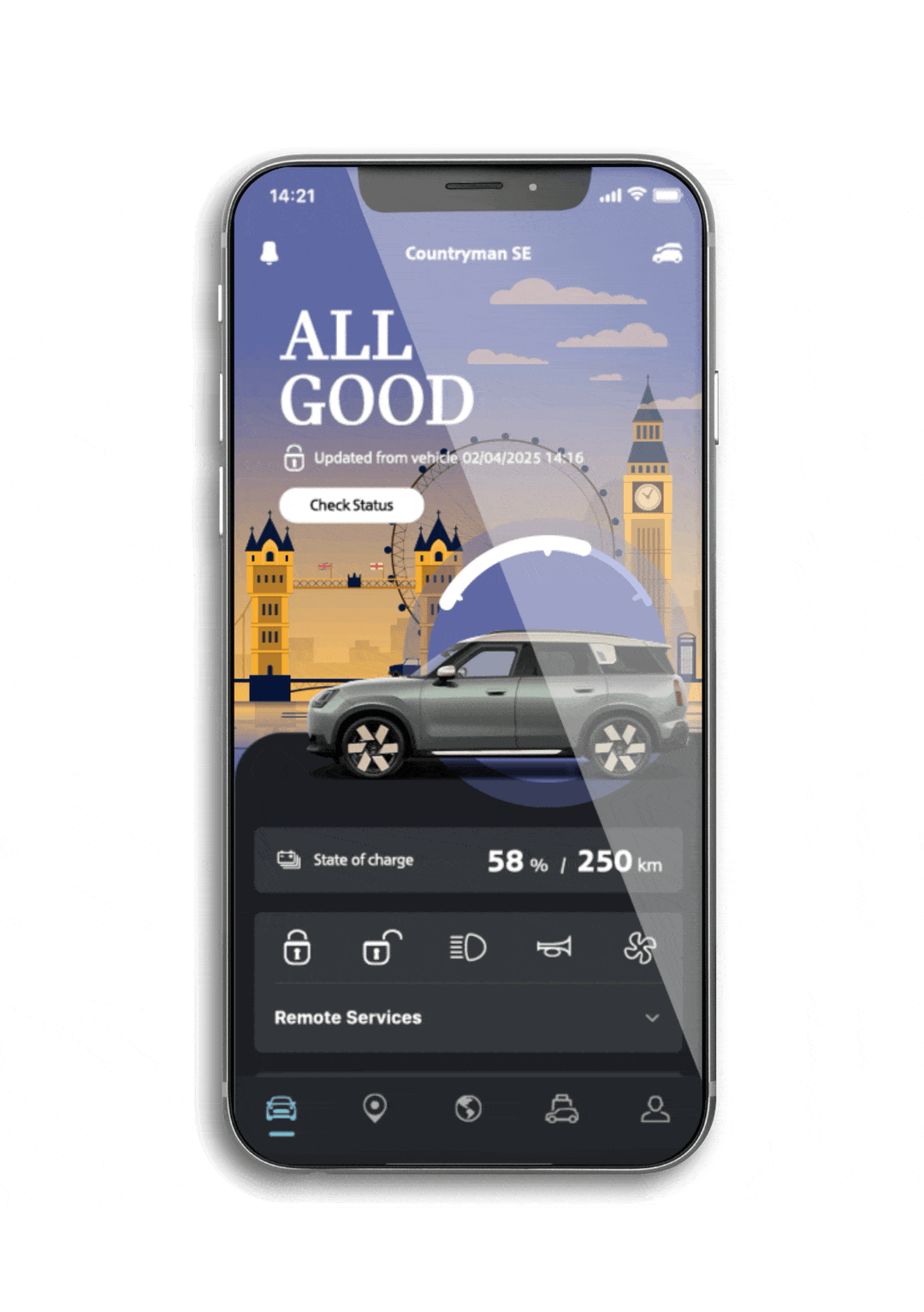 *Το MINI App είναι συμβατό με όλα τα μοντέλα MINI που κατασκευάστηκαν από τον Μάρτιο του 2018 και εξής, σε συνδυασμό με τις προαιρετικά διαθέσιμες ConnectedDrive Services και συμβατό smartphone. Για βέλτιστη εμπειρία χρήσης της εφαρμογής, τα αυτοκίνητα πρέπει να εξοπλίζονται με τις Απομακρυσμένες Υπηρεσίες. Η διαθεσιμότητα και οι λειτουργίες του MINI App ενδέχεται να διαφέρουν ανάλογα με τη χώρα και τις προδιαγραφές του εκάστοτε μοντέλου.